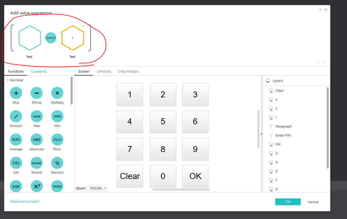 I'm sorry for the misunderstanding, here is an example that corresponds to the action you are trying to perform, pay attention to the interaction of each number: "On Click" + "Set Value" - to Input Field above. Value is Input Value [concat] Number value.