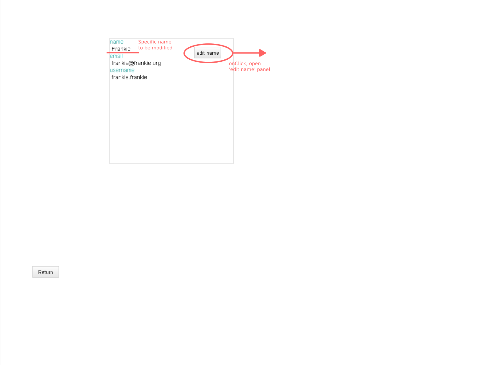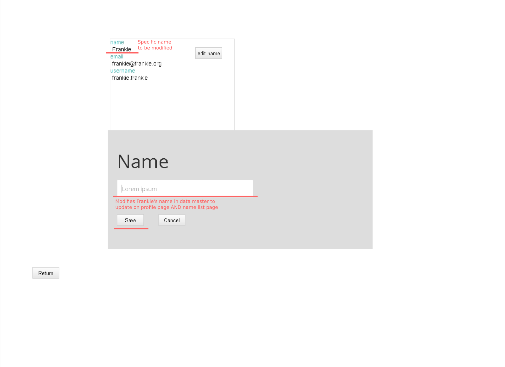 The profile page would have columns to edit the user's info separately. Clicking edit next to the name for instance, a box appears so that the user can edit their name, and whatever value the user has given the input element applies both to the name on that profile page AND the name in the list of users. The particular edit that the user makes should update and persist across the system.