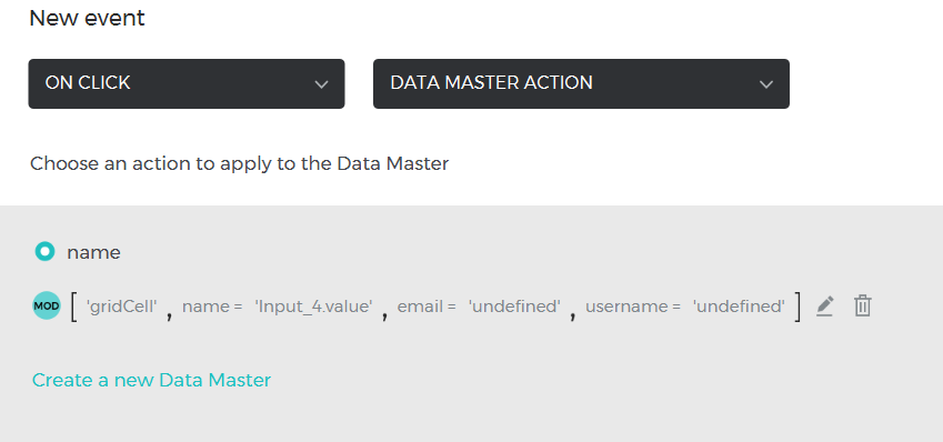 Create a new variable which will have the value of the cell grid, in the save button, the event has to be "On Click" + "Data Master Action" and give the variable the input value (I attached a screenshot).