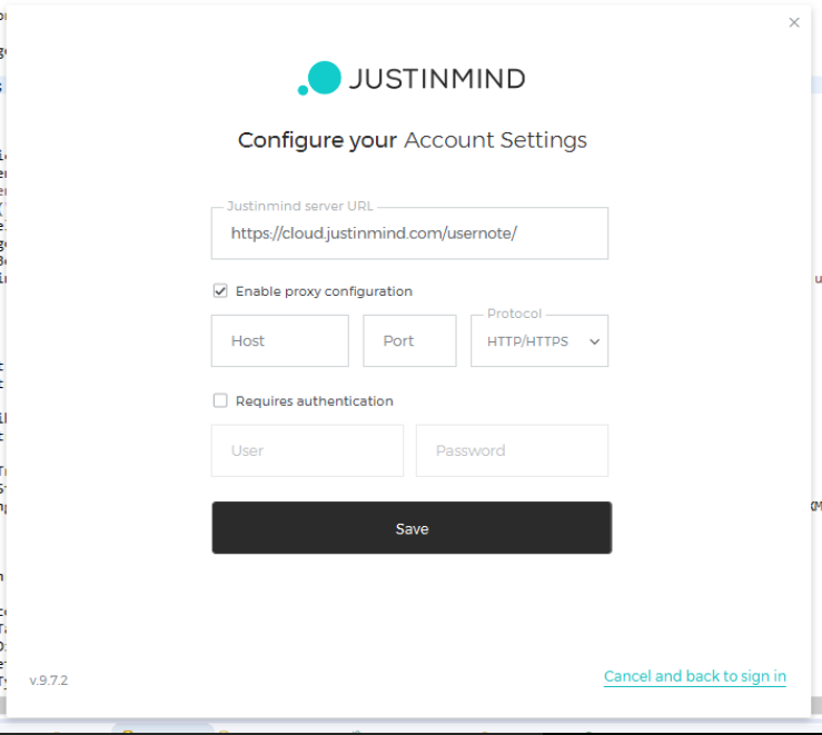 I am having the same issue and I have the latest version installed. I cannot get to a prompt to log in, so I cannot get to setting up proxy settings within Justinmind