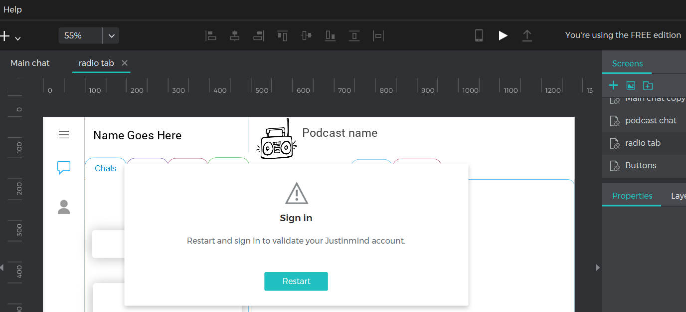 After I updated to 9.6.0, I keep getting this message: "Restart and sign in to validate your Justinmind account." When I restart it, forces me to restart again. It usually happens a minute after starting the application. It's frustrating because I can't get anything done this way. I have tried logging out and signing back in, but the problem persists. I have attached a screenshot of the popup I get.