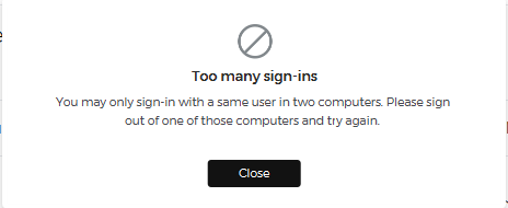 When trying to login, we are getting an error message 'Too many sign-ins' even though we are signed out from all devices. Attaching the error screenshot. Kindly help us in resolving this as soon as possible.
