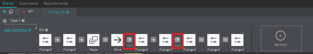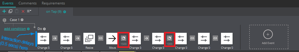 Hi Sonia, thanks for looking at my file and getting back to me. You're correct that I do have some built-in delays in my interactions, eg. the 1500 and 1000 millisecond ones you found. However, the delay problem I'm talking about is the delays at the beginning of the interaction chain, the first thing that is supposed to happen immediately after the tap. (the delays you've identified delay the 5th and 7th event in the chain, while the delay I'm talking about is the first) Please see the attached version of the screenshot you sent, to see what I mean.