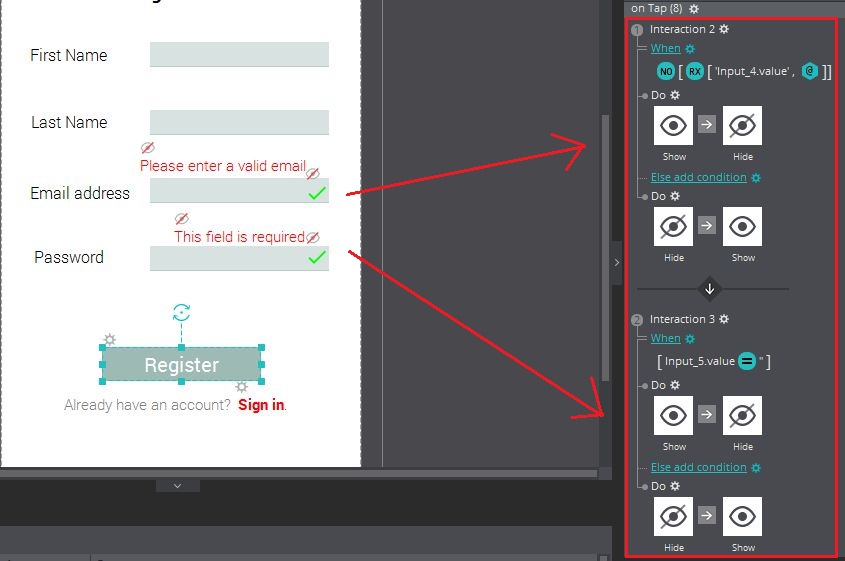 That makes perfect sense. Apologies - I should have been more clear. This should be a condition that's added to a separate event. So right now you have two events - one that shows the 'please enter a valid email' text, and another that shows the 'this field is required'. You can create one last event that is an "On Tap" + "Link to" event, which links to another screen. Then, add a condition for that event, like the one in the image I attached above. The way you created the events is actually the best way to do this, rather than creating one event with three different conditions.