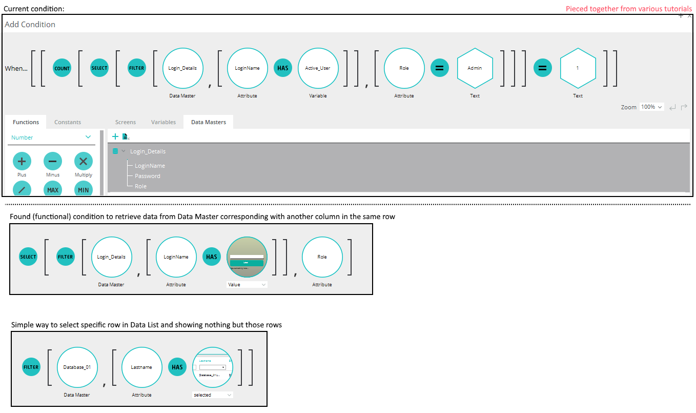 I wanted to use the variable "Active_User" to look at specific columns in a row of my Data Master, see what their role is and use that as a condition to show/hide the UI.