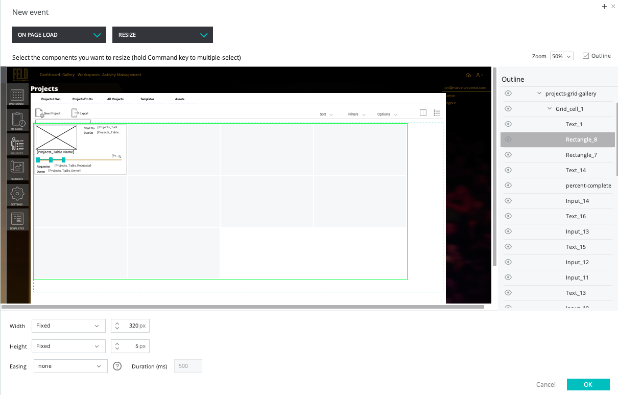 Here's an easier way - resize according to the value of the percentage and its percentage relative to a container. We placed the percentage rectangle in a dynamic panel. The event will resize the rectangle according to the percentage relative to the panel. For example, a percentage value of 90% resizes the rectangle to 90% of the dynamic panel.