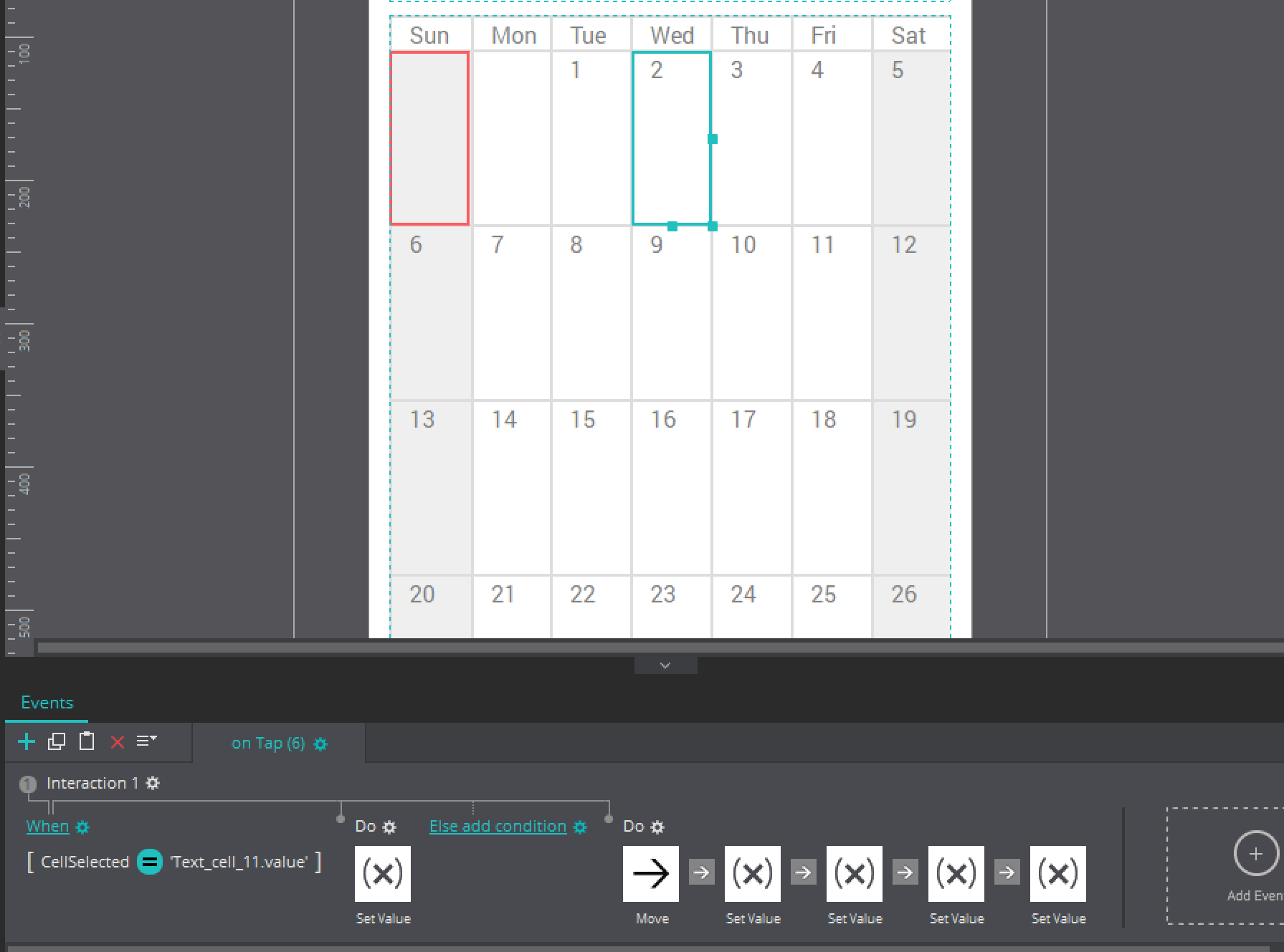 Instead of the 'else' condition, create another event on the cell but with an 'on variable change' trigger. Select to listen to the 'cellselected' variable. Then add the do and else actions necessary to cover the 'selected' and 'unselected' states. Finally, use the 'copy events' tool in the toolbar with the rest of cells. That should do the trick.