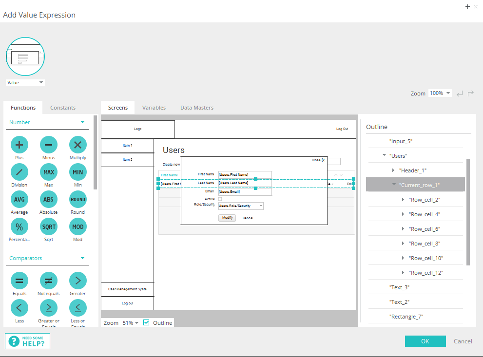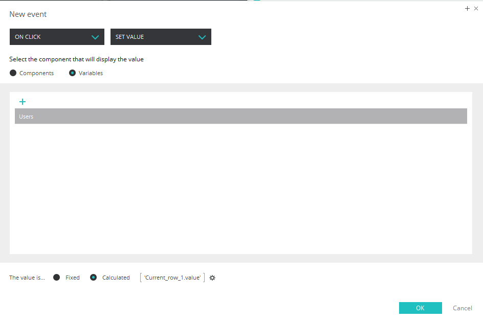 on click set values >> variables assigned to users where it's calculated to ['Current_row_1.value]'