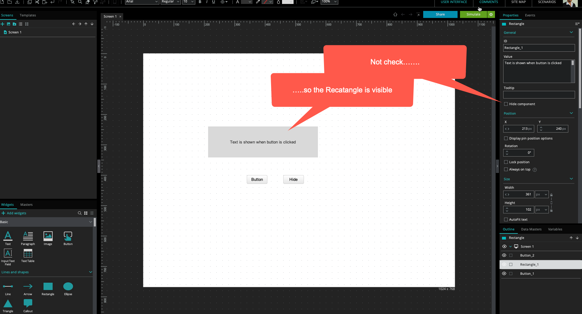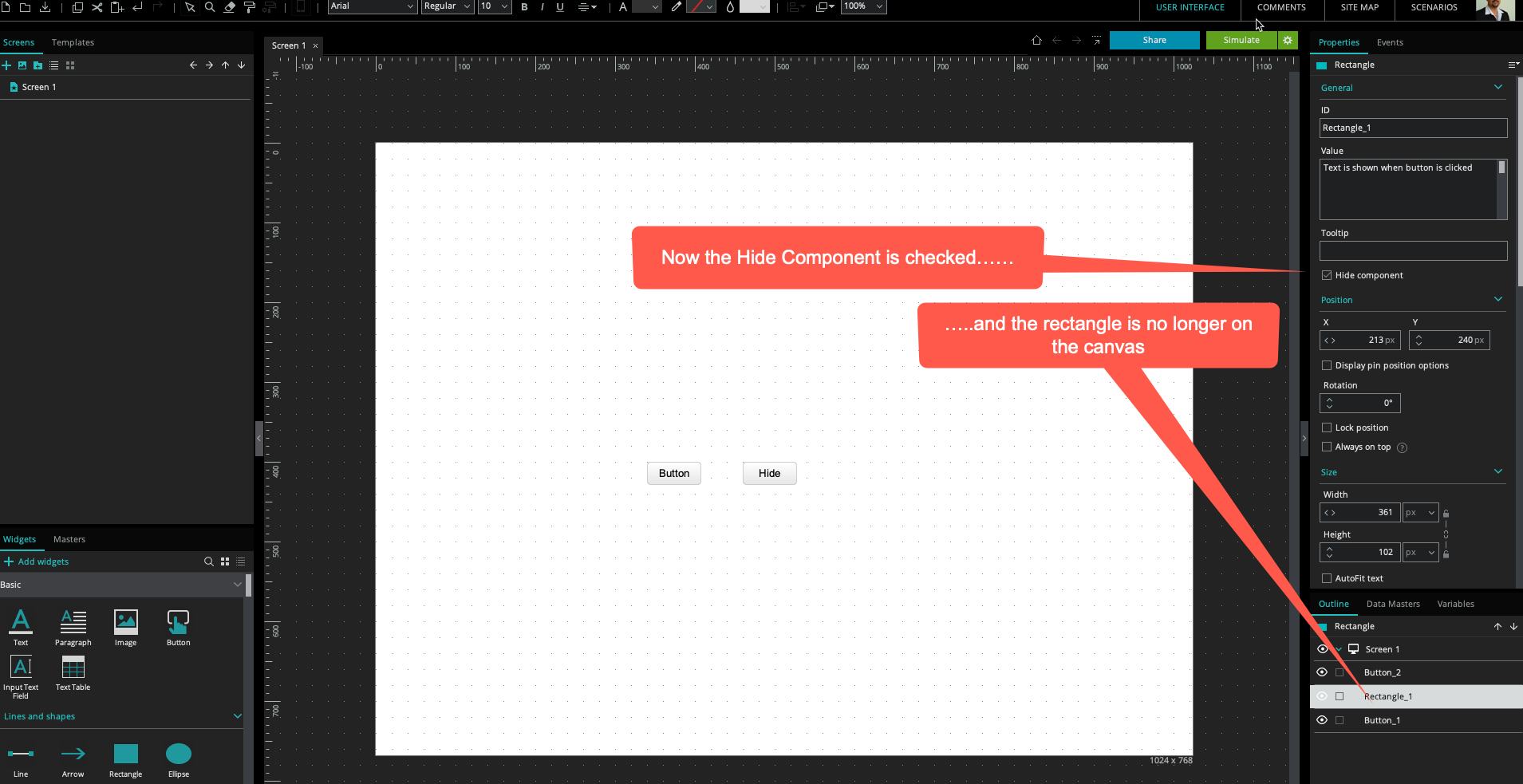 But in edit mode when I check the HIDE COMPONENT box the TEXT box (Rectangle_1) also disappears from screen.