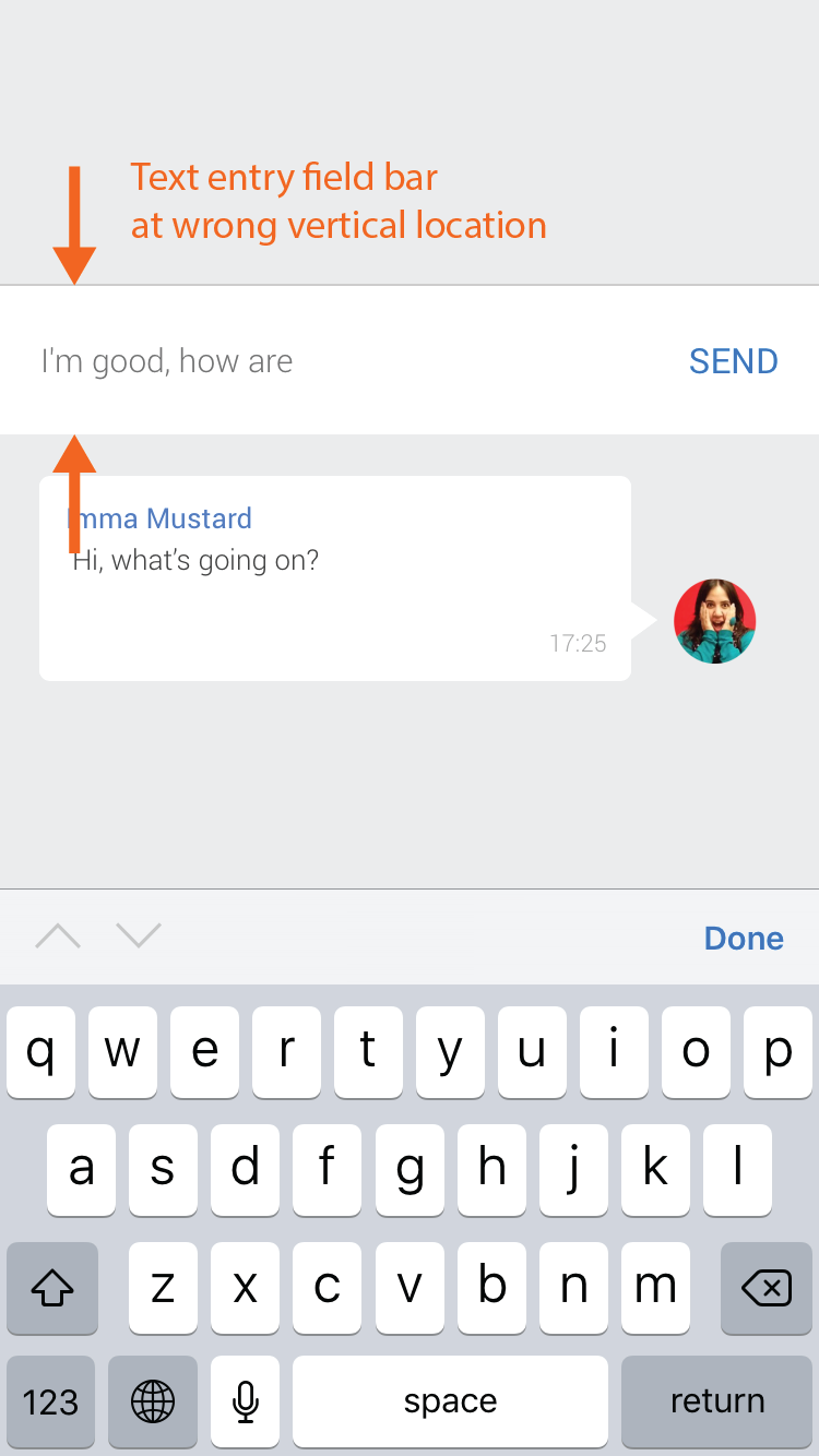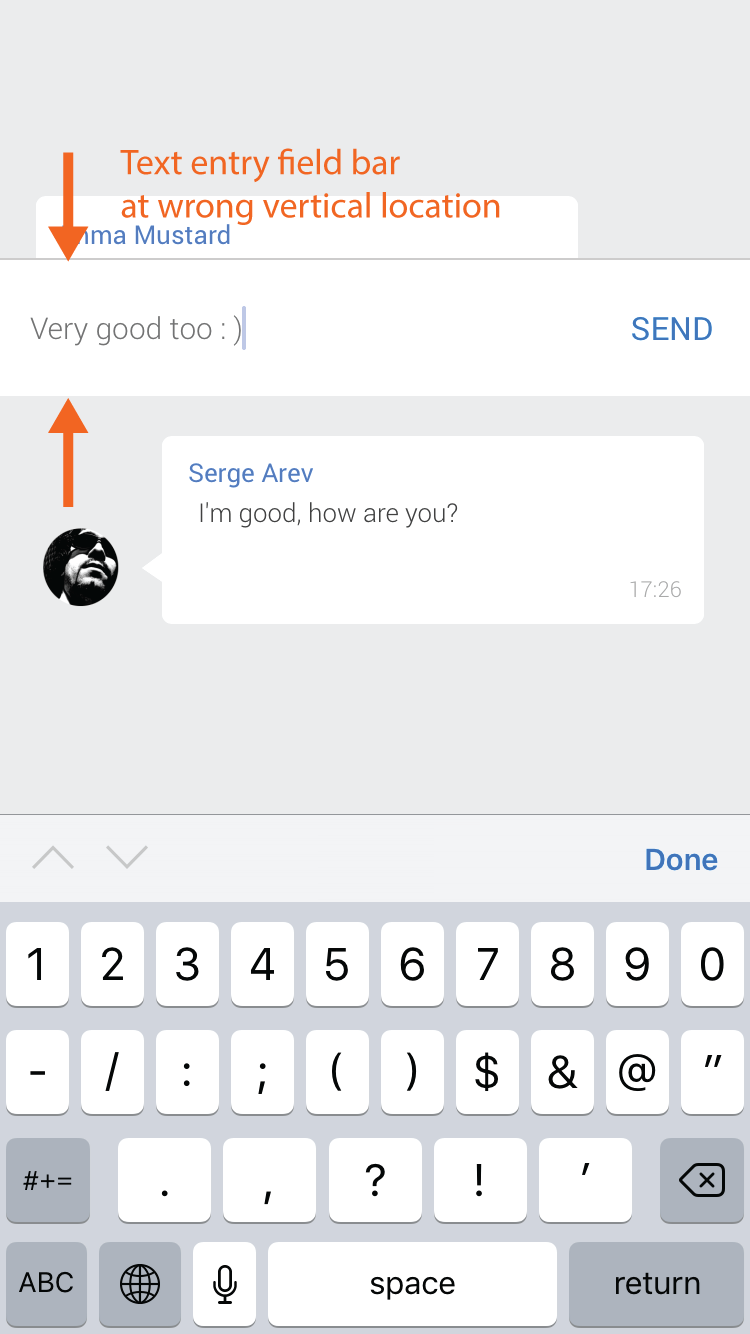 Hi, I'm trying to build a simulated chatbot (for iPhone) and I'm experiencing a weird mis-location of the keyboard text entry field. It's happening even with the example file that Justinmind has provided on their tutorial page: