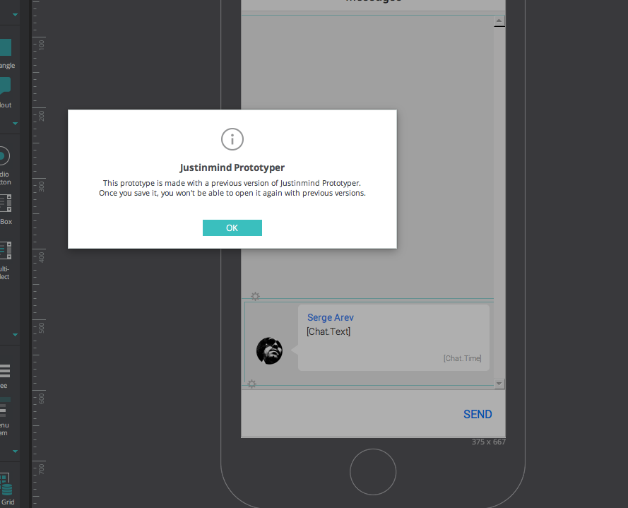 When I open the demo file, I do get a warning message saying "This prototype is made with a previous version of Justinmind prototyper..." I also got this message when I opened the file with the previous pre-7.8.0 version of Mac Justinmind, if I recall. (see attached screenshot)