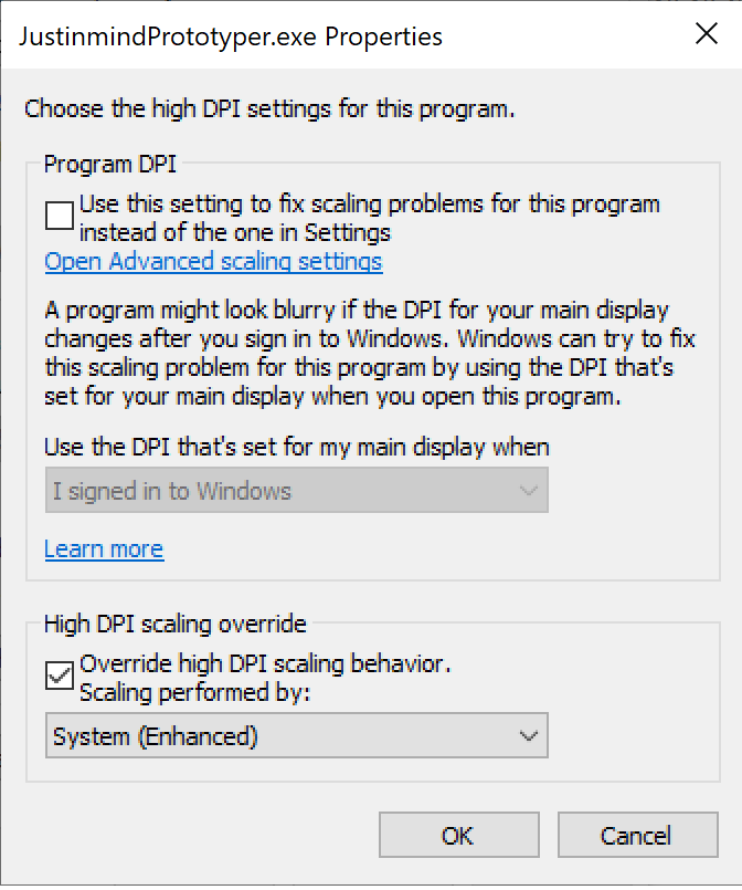 I use version 8.7.0 and there is no JustinmindPrototyperHiDPI.exe file at all. All system compatibility settings applied to JustinmindPrototyper.exe do not really help to solve the problem.