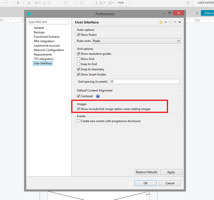 There's a checkbox, "[✓] Don't show again" on the "Add image as..." dialog that appears when inserting an image. That checkbox setting doesn't seem to be remembered between launches of JustinMind.
